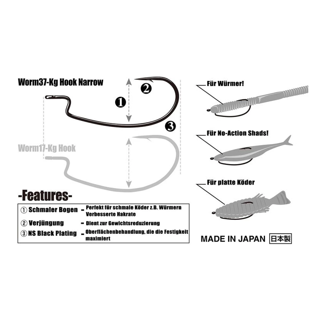 De Kg Hook Narrow Worm37 is geoptimaliseerd voor gebruik met slank kunstaas zoals wormen, dunwandige rivierkreeften en dunwandige shads zoals de Easy Shiner. De vorm van de Worm37 met de haakpunt boven het haakoog zorgt ervoor dat hij in elke situatie gemakkelijk in de kaken van de vissen kan doordringen. Vooral bij het vissen op grote afstand of met licht materiaal is dit een groot voordeel.